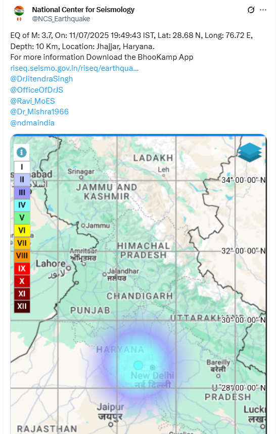 ଓଡ଼ିଆ ନ୍ୟୁଜ୍: ଦିଲ୍ଲୀରେ ପୁଣି ଭୂମିକମ୍ପ । ଭୂମିକମ୍ପ ଝଟକାରେ ପୁଣି ଥରିଲା ଦିଲ୍ଲୀ । ଲଗାତାର ୪୮ ଘଣ୍ଟା ଭିତରେ ୨ ଥର ଦିଲ୍ଲୀକୁ ଲାଗିଲାଣି ଭୂକମ୍ପର ଝଟକା । ଆଜି ସଞ୍ଜରେ ପୁଣି ଦିଲ୍ଲୀରେ ଭୂମିକମ୍ପ ଅନୁଭୂତ ହୋଇଛି ।ଭୂକମ୍ପର ତୀବ୍ରତା ରିକ୍ଟର ସ୍କେଲରେ ୩.୭ ଥିବା ବେଳେ ସଂଧ୍ୟା ୭.୪୯ରେ ଭୂମିକମ୍ପ ଅନୁଭୂତ ହୋଇଛି । ଭୂକମ୍ପର କେନ୍ଦ୍ରସ୍ଥଳ ହରିୟାଣାର ଝାଜର ରହିଛି ।ତେବେ ଗତକାଲି ବି ଦିଲ୍ଲୀ ଭୂମିକମ୍ପରେ ଦୋହଲିଥିଲା । କାଲି ମଧ୍ୟ ଭୂକମ୍ପର କେନ୍ଦ୍ରସ୍ଥଳ ହରିୟାଣାର ଝାଜର ରହିଥିଲା ବେଳେ ଗତକାଲି ସକାଳେ ହୋଇଥିଲା ଦିଲ୍ଲୀରେ ଭୂମିକମ୍ପ ।