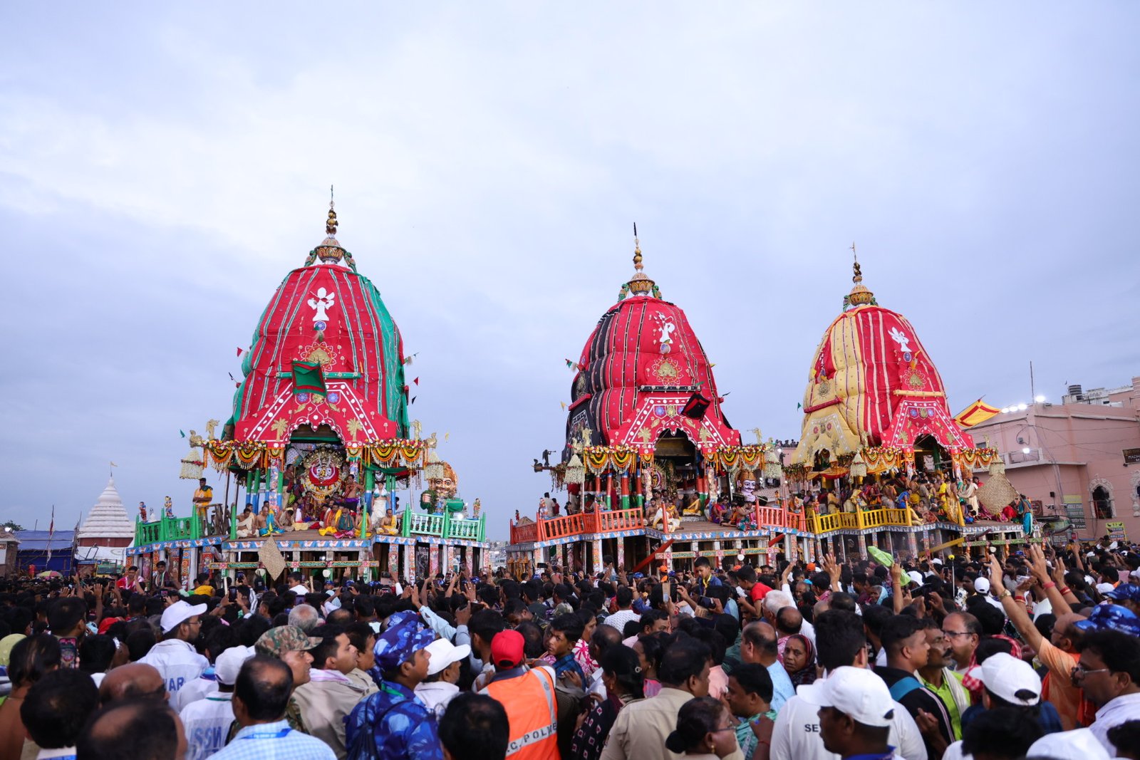 ଓଡ଼ିଆ ନ୍ୟୁଜ୍: ରଥାରୂଢ଼ ଶ୍ରୀଜୀଉଙ୍କର ବଡ଼ ତଢ଼ାଉ ବେଶ ବା ସୁନାବେଶ ସମ୍ପୂର୍ଣ୍ଣ ହୋଇଅଛି। ବଡ଼ ଠାକୁର ଶ୍ରୀବଳଭଦ୍ର, ମହାପ୍ରଭୁ ଶ୍ରୀଜଗନ୍ନାଥ ଏବଂ ମା’ ସୁଭଦ୍ରା ରଥ ଉପରେ ସୁନା ଅଳଙ୍କାରରେ ସଜ୍ଜିତ ହୋଇ ସୁନାବେଶରେ ଶ୍ରଦ୍ଧାଳୁଙ୍କୁ ଦର୍ଶନ ଦେଉଛନ୍ତି।